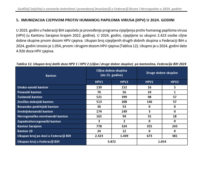 Mali broj doza (36 za prvu dozu) dat je i u Bosansko-podrinjskom kantonu, ali to je ujedno i najmaloljudniji kanton u Federaciji sa svega nešto preko 20.000 stanovnika (prema popisu iz 2013), te je to očekivano, za razliku od populacije u Zapadnohercegovačkom kantonu koji ima oko 94.800 stanovnika (prema popisu iz 2013), a u 2024. primijenjene su samo 3 doze HPV1 (prva doza) i 2 doze HPV2. U Kantonu 10 ima oko 84.000 stanovnika u 2024. godini, ali su date samo 24 doze HPV1 i upola manje doza HPV2.